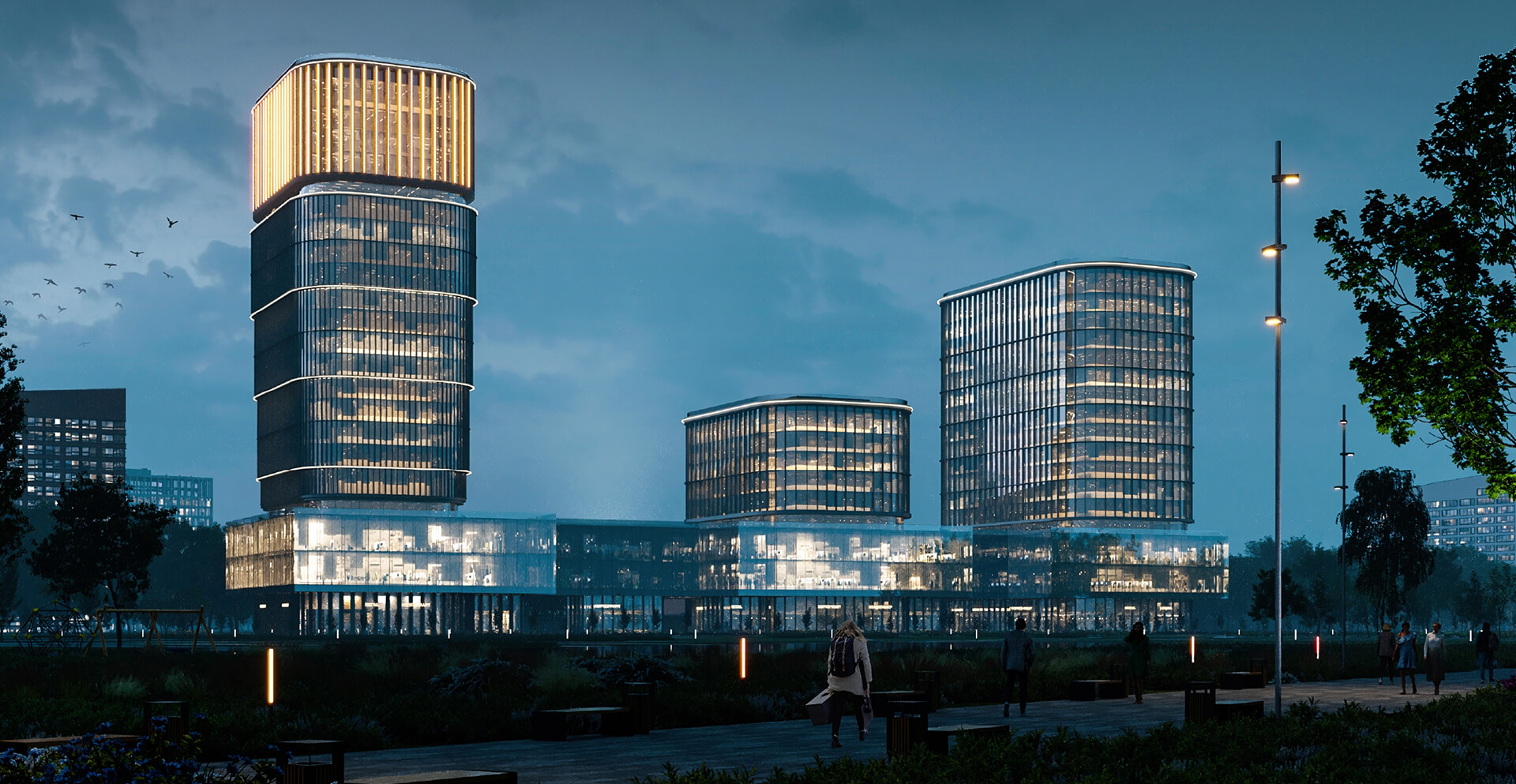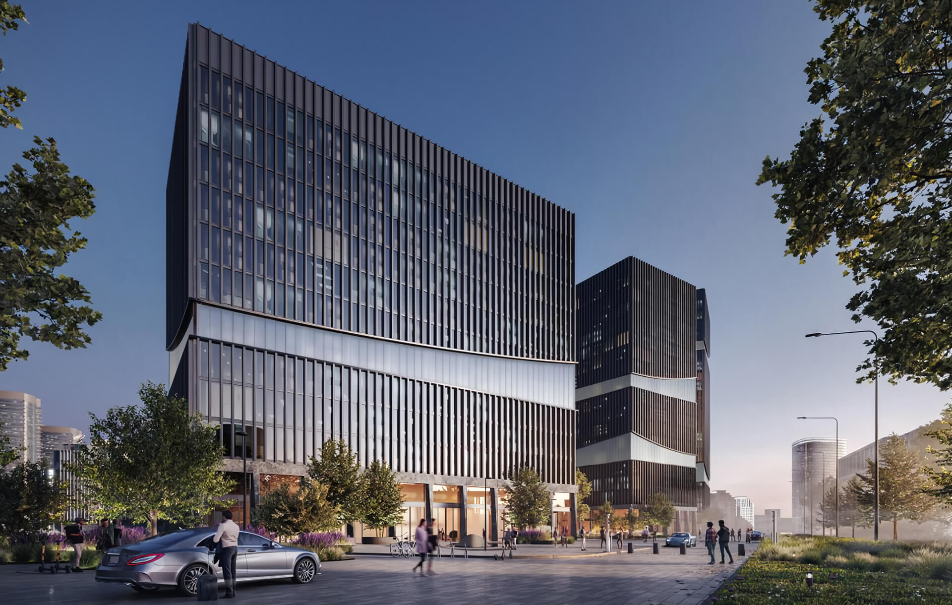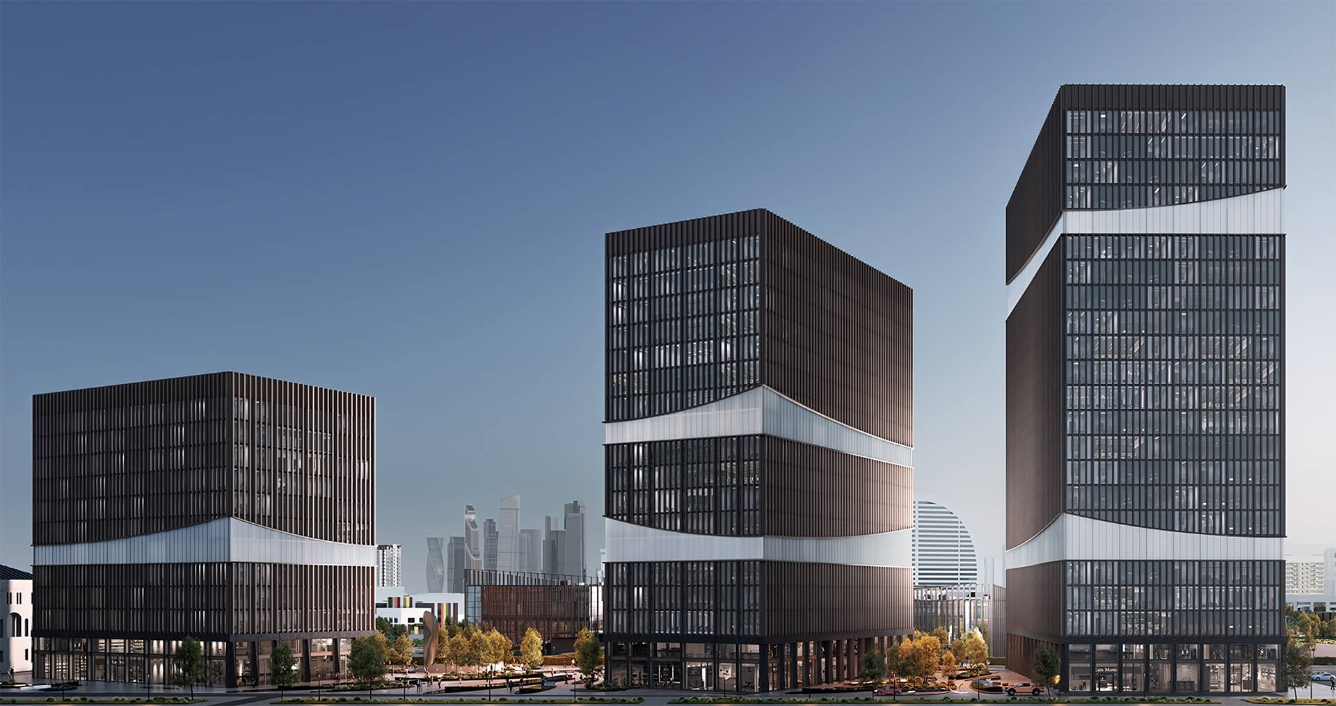 Три офисных здания отличаются выразительными фасадами, выполненными из современных материалов: энергоэффективных стеклопакетов, алюминиевых ламелей и натурального камня. Высокая степень остекления обеспечивает максимальный доступ дневного света и панорамные виды на парк площадью 29 га. Лаконичный дизайн дополняется монументальностью оснований и динамичными линиями фасадов, что создает эффект легкости и элегантности.