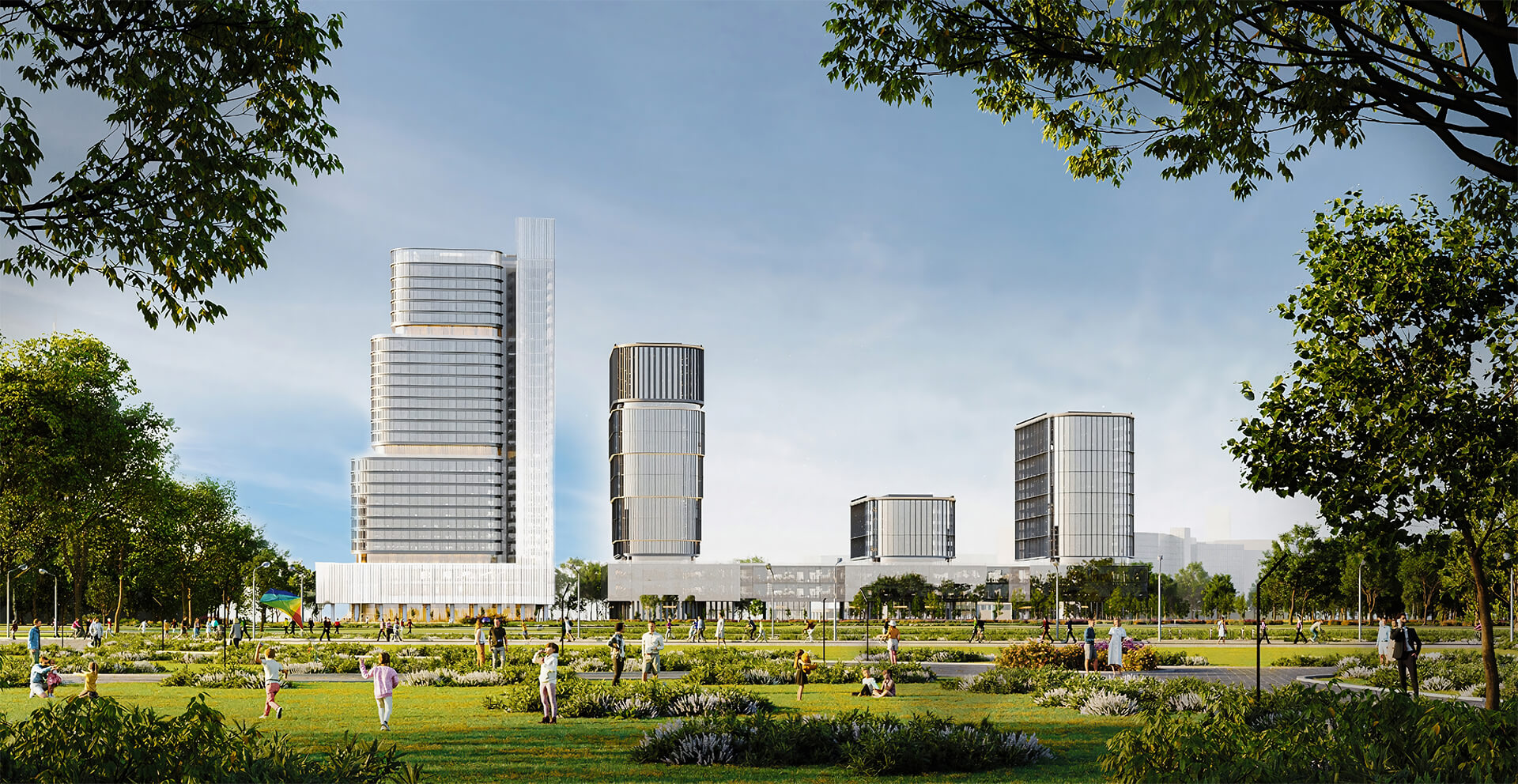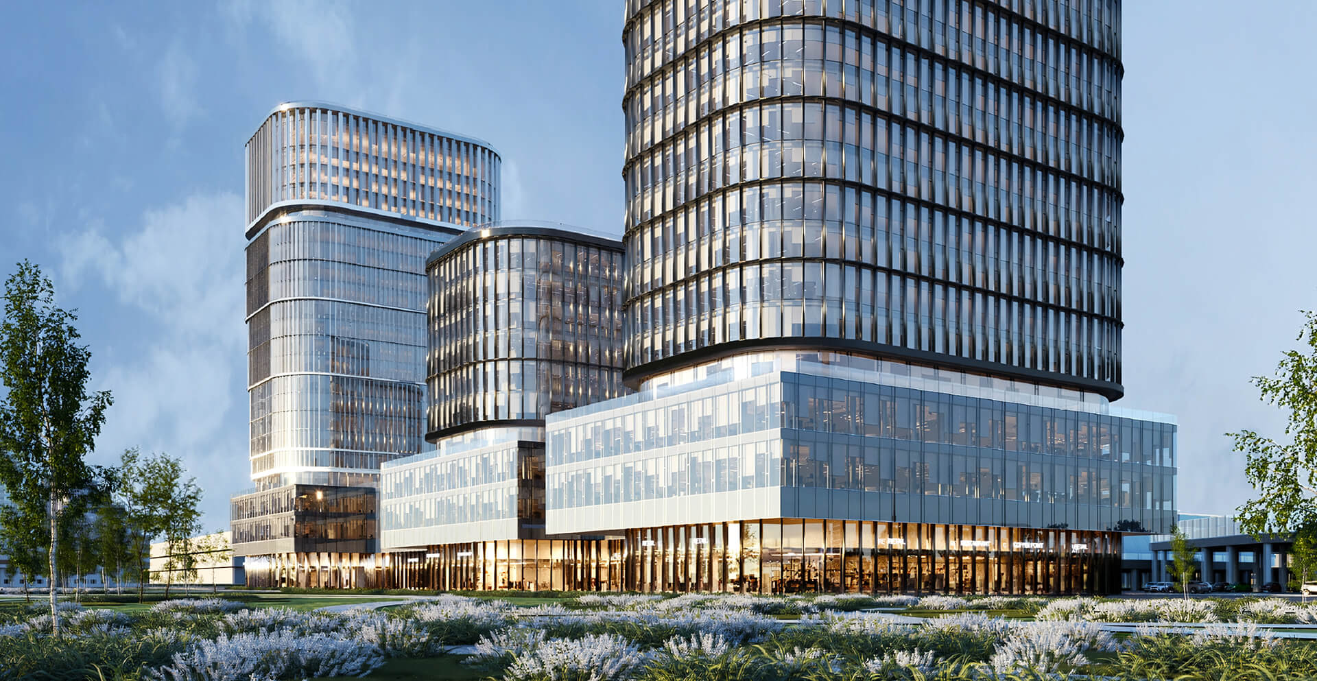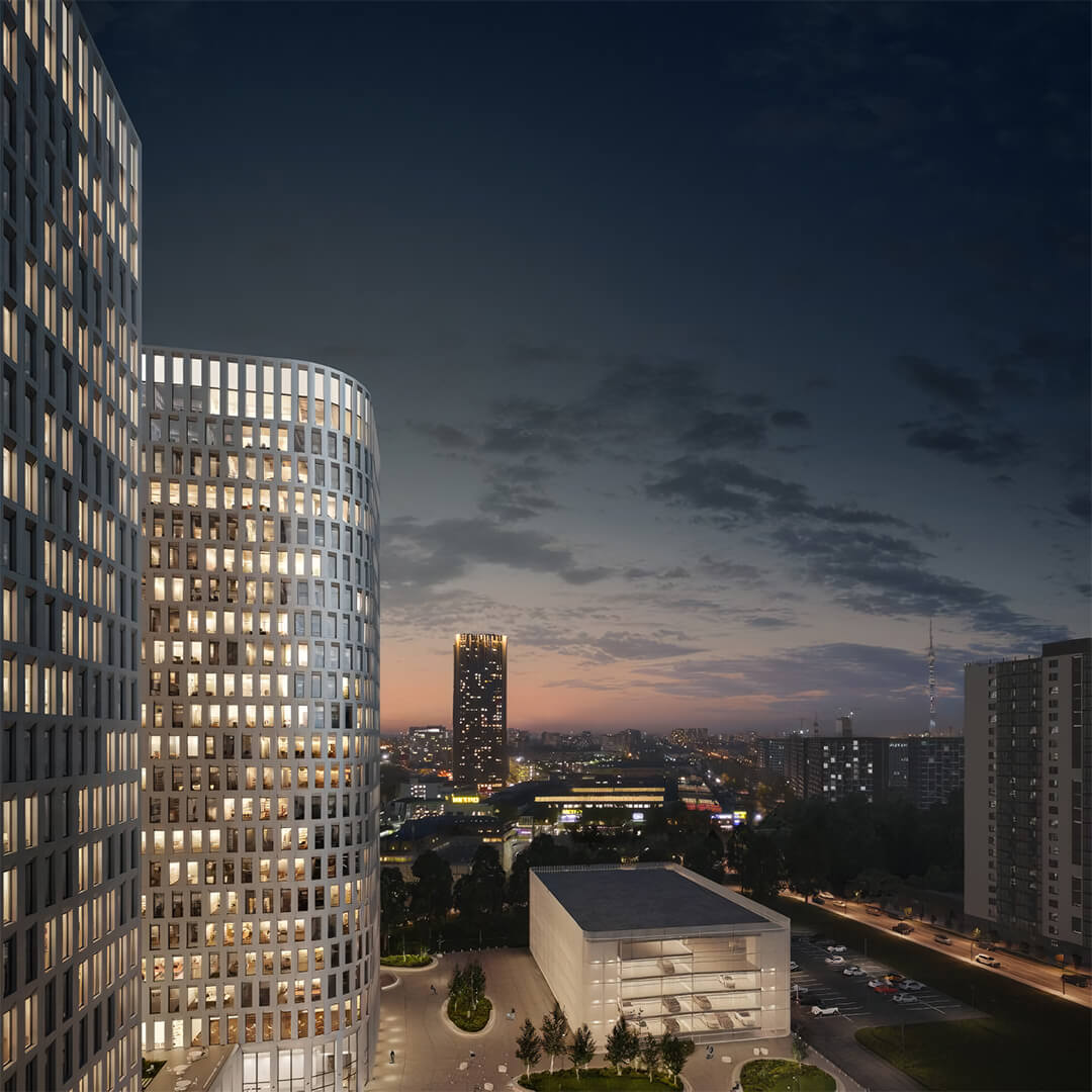 Три офисных здания отличаются выразительными фасадами, выполненными из современных материалов: энергоэффективных стеклопакетов, алюминиевых ламелей и натурального камня. Высокая степень остекления обеспечивает максимальный доступ дневного света и панорамные виды на парк площадью 29 га. Лаконичный дизайн дополняется монументальностью оснований и динамичными линиями фасадов, что создает эффект легкости и элегантности.