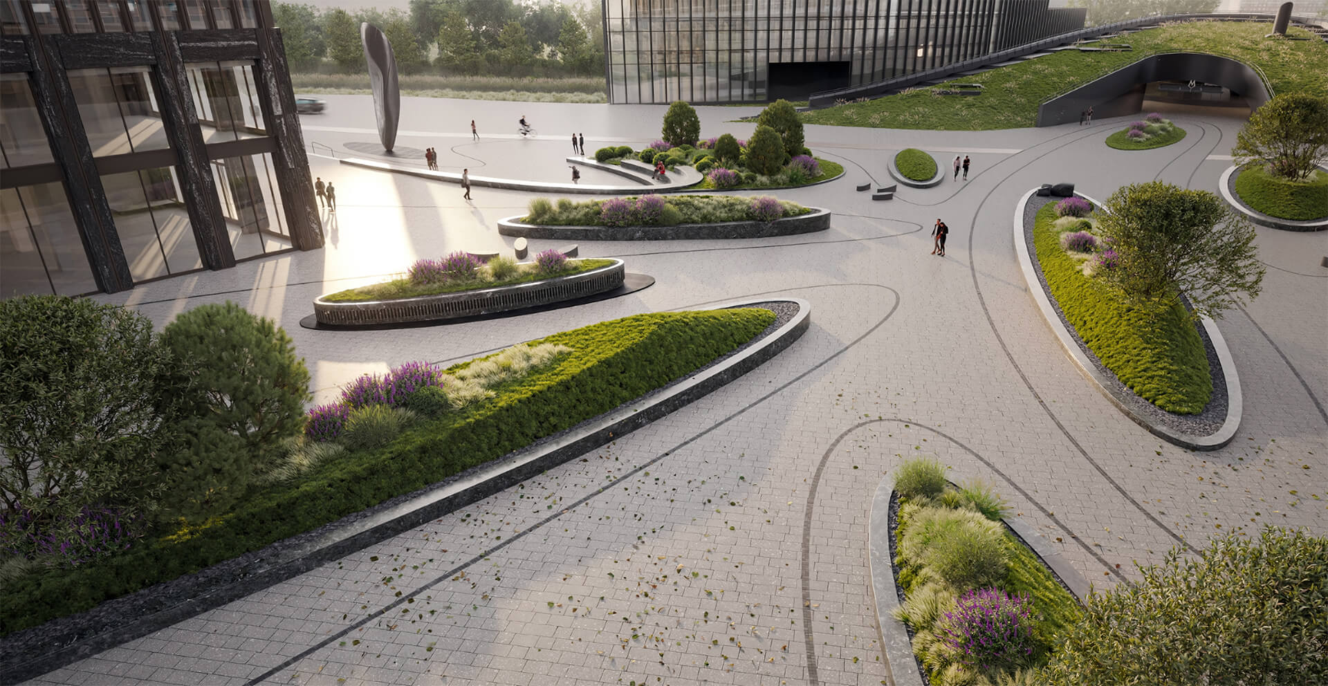 Территория около бизнес-центра органично вписывается в парковую зону, предоставляя резидентам и гостям доступ к благоустроенным местам для прогулок, общения и расслабления. Пространство под колоннами первого этажа формирует комфортное место для встреч и отдыха, плавно переходящее в природное окружение.